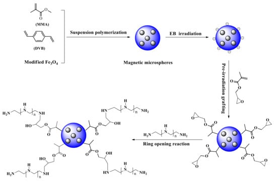 In the third step, GMA was grafted onto the surface of the magnetic PMMA through electron beam irradiation. In a typical preparation process, 3.0 g of magnetic PMMA microspheres were accurately weighed and packaged into a plastic bag and the bag was vacuum sealed. Then, 20 mL of 30% (v/v) glycidyl methacrylate methanol solution (GMA) solution was injected into the bag with a syringe. The sealed samples were irradiated by a 1 MeV electron accelerator (Wasik Associates, Dracut, MA, USA) from 20 to 120 kGy, with a dose rate of 20 kGy/pass. Then, the samples were filtered, washed with methanol and water to remove the monomers and byproducts and dried at 323.15 K for further use. The grafting yield (GY) was calculated using Equation (1) []:
