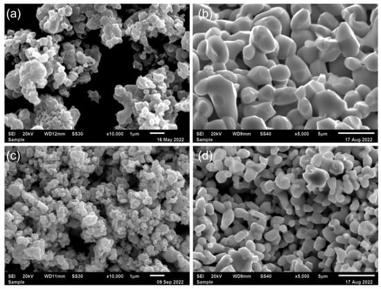 SEM images for FeSbO4 powder calcined at (a) 900 °C and (c) 1000 °C for 4 h and fractured cross-sections of FeSbO4 pellets, (b) C-900 and (d) C-1000, sintered at 1200 °C for 4 h.