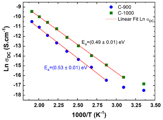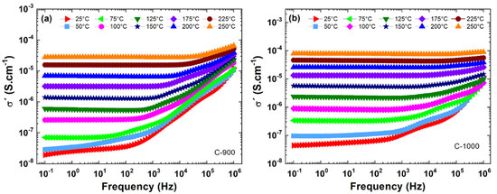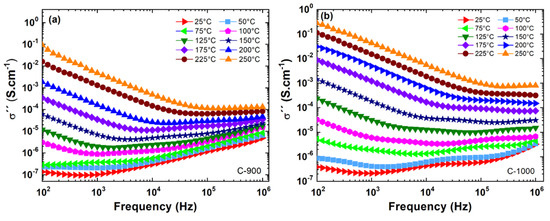 The C-900 sample with showed a smaller dispersion in its imaginary conductivity () at low frequencies compared to sample C-1000 , according to the results in Figure 5. At high temperatures, both samples showed excessive noise in the region between 0.1 to 10 Hz. For this reason, these measurements in this frequency range were omitted in Figure 5. This problem is associated with noise in the sample holder electrodes in measurements performed at high temperatures.
