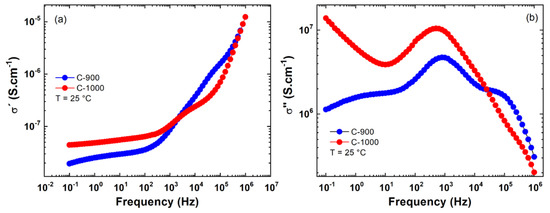 Results of the electrical conductivity versus frequency for C-900 and C-1000 ceramics: (a) real part (); (b) imaginary part ().