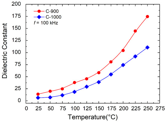 The temperature-dependent dielectric constant of frequency for C-900 and C-1000 ceramics.
