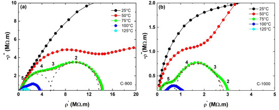 Figure 8a,b shows the Argand or Nyquist diagrams (the complex plane) for the electrical impedance spectrum of the samples that presented a single phase (C-900 and C-1000). Electrical measurements were performed at temperature levels ranging from 25 to 250 °C. In this diagram, each experimental point was measured at a frequency that increases from right to left between values of to . Analyzing the impedance curves for a temperature of 75 °C, sample C-900 presented semicircles with higher values on the abscissa than sample C-1000. In both ceramic samples, the semicircles decrease with the increasing temperature of the FeSbO4 ceramic sample.
