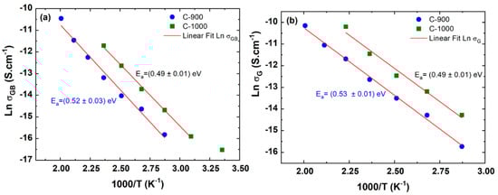 Arrhenius plots of the grain interior and grain boundary conductivities for FeSbO4 ceramics (C-900 and C-1000) for regions: (a) grain boundary; (b) grain.