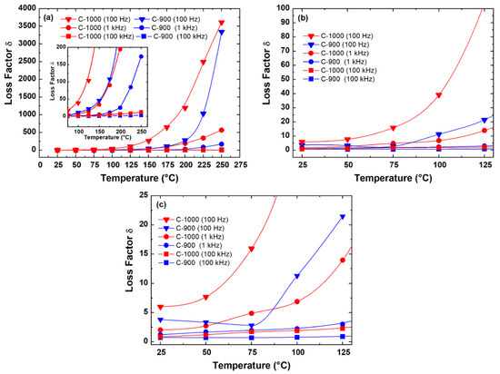 Figure 11 illustrates the loss factor () as a function of temperatures measured at 0.1, 1, and 100 kHz of the antimony ferrite samples. In the spectrum of Figure 11a an expected increase in the loss factor as a function of temperature can be observed in all samples. The inset is a zoom for a temperature between 75 and 260 °C to distinguish the temperature-dependent loss factor measured at 100 kHz for the C-900 and C-1000 samples. Figure 11b shows strong dispersion in loss factor at temperatures above 100 °C in the FeSbO4 ceramic samples measured at 0.1 kHz to measurements performed at frequencies of 1 and 100 kHz. The understanding of this high dispersion at low frequencies can be explained mainly by the relationship between the electrical conductivity and the loss factor given by where is the frequency and, is the real permittivity [33]. As seen in Table 2 and Figure 11a, the porous ceramics (C-1000) have an increase in their conductivity due to the influence of pores in the grain boundary region; therefore, there was an increase in their loss factor, . Emphasizing that this high dispersion at low frequencies may also have a smaller contribution as a function of grain size.
