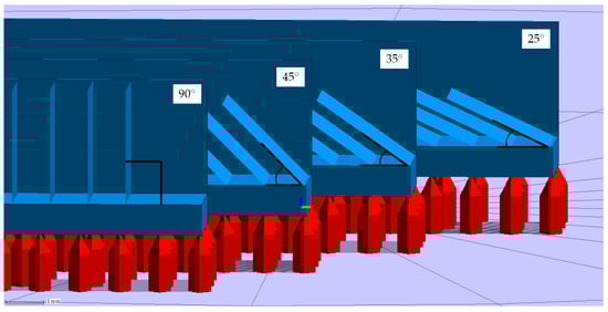 The first experiment consisted of printing single-track-based thin walls by scanning the layer with one laser passage for a wall per layer. The variables factors of the experiment were laser power and scanning speed with levels presented in Table 1. The layer thickness of 20 μm were considered for all cases. The window of process parameters was chosen according to the previous work [25]. The walls were printed with 4 incline angles: 90°, 45°, 35°, and 25° as shown in Figure 1. The walls were placed on the platform with columnar supports; a stiffener was added to the back to avoid accidental deformation or strains due to relaxation of thermal stresses.