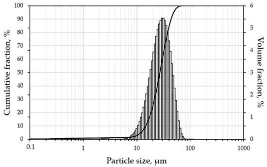 The results of the granulometric analysis are presented in Figure 3 as a histogram with unimodal normal distribution. The found percentiles of the equivalent diameter are d10 = 15.1 µm; d50 = 27.8 µm; d90 = 45.0 µm. The Particle Size Distribution (PSD) fits the 15–45 µm fraction which is optimal for the LPBF process. The width of the PSD is characterized by the standard deviation near the mean value or SPAN given in the Equation (1):