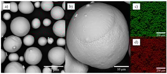 In various works devoted to LPBF technology, it has been shown that the well-chosen initial powder material is the basis for the successful consolidation with minimum defects [31,32,33,34,35]. The most important properties of the powder are particle morphology, chemical composition, and microstructure [31]. In terms of the resolution study, these factors will be fundamental for achieving repeatability. Thus, the initial powder was studied by laser particle sizer, SEM with EDS detector, and Hall funnel.
