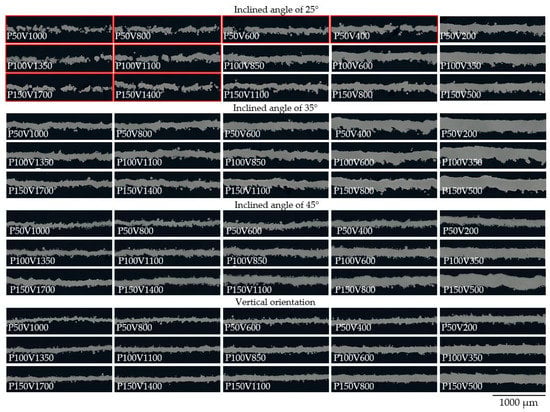 Several scanning strategies could be employed for the manufacturing of micro-objects via the LPBF process. The first scanning strategy refers to layer-wise scanning of the powder bed with a single laser passage. The second mode which widely used for the strut-based lattice structures based on the generation of multiple perimeter contours [40] along the border of the 3D model. The third type is the conventional generation of the contours with subsequent hatching. It should be noted that despite the highest resolution achievable with the first mode, most of the build processors and commercial LPBF equipment do not switch to such a scanning strategy when the corresponding feature size of an object is comparable with the width of a single track. Wu et al. [17] found the possibility of switching from the raster mode to the single-bead mode on the EOS equipment. The adopted slicer algorithm used in this study enables gradual change of the scanning mode from the raster to the multiple contours’ generation and finally to the single vectors. In this study, we consider samples produced with the first type of scanning strategy. Optical microscopy (OM) of cross-sections for thin walls consolidated with regimes given in Table 1 are presented in Figure 5. Samples with lack of fusion defect are highlighted with red. The cross-sections are subdivided by the inclined angle to the base plate, as demonstrated in Figure 1, however, all images are presented horizontally.