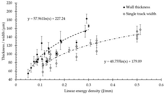 Dependence of wall thickness and width of single tracks [25] on linear energy density for vertical samples.