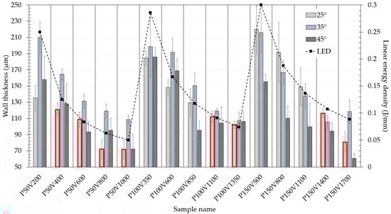 Figure 7 shows the wall thickness with standard deviation measured from samples with inclined angles of 25°, 35°, and 45°. The minimum wall thickness of 61 ± 6 μm was achieved for the P150V1700 sample. For each regime, the linear energy density value is marked with a square marker and dashed line. It is seen that in the case of inclined walls the thickness also correlates with the linear energy density and the minimum value is comparable to vertical specimens. Thus, the minimum wall thickness has a weak dependence on the angle of inclination and is mostly controlled by the melt pool geometry.