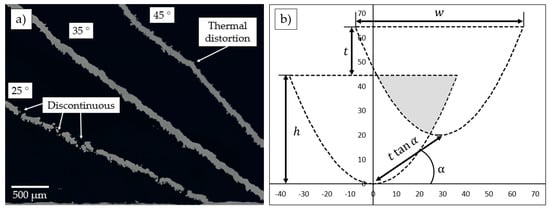 The bars highlighted with red (see Figure 7) represent walls with a lack of fusion defect. Commonly lack of fusion defect is associated with pores filled with unmelted particles and mostly controlled by the overlapping of the adjacent tracks. The lack of fusion defect in the case of single track consolidation leads to the discontinuous structure shown in Figure 8a. Discontinuous element with open pores significantly decreases the mechanical properties of the micro object. The condition of the defect appearance is an interplay among the melt pool size and inclined angle which in turn result in different overlapping of the adjacent tracks. It can be seen that all samples with defects have the lowest inclined angle of 25° and low linear energy density. A simple model can be used to evaluate the limits of both factors. Two adjacent layers are considered in the perpendicular plane to the laser scanning vector. In each layer a melt pool represented with parabolic shape and overlapping is estimated. We consider following assumptions: the shape of the melt pool corresponds to the shape obtained during the scanning of the powder bed on the bulk substrate, the melt pool upper surface is flat, the formation of the tracks is stable. As input parameters, layer thickness (t), inclined angle (), height (h), and width (w) of the melt pool are considered. The dimensions in Figure 8b represent the experimentally measured data on the single tracks for the P150V1400 from [25]. In this case, parameter can be used for the single track consolidation as an analog of hatch distance. Accordingly, for samples P150V1400, P150V1100, and P150V800 calculated overlapping areas are 8.8, 17.7, and 29.7% respectively. In prescribed process parameters matrix samples with overlapping areas below 10% resulted in a lack of fusion defect. However, more experimental data on the melt pool geometry is required to formulate limitations for inclined object manufacturing based on this model.