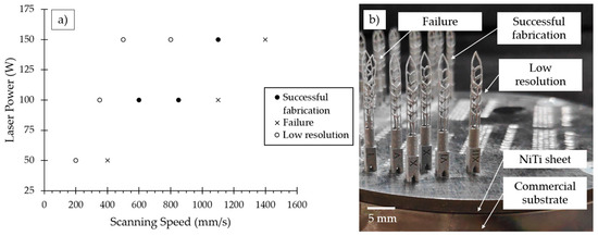 The technological parameters for SAF samples manufacturing were determined based on the results of Section 3.2. The corresponding matrix in the laser power and scanning speed coordinates is presented in Figure 9a. All regimes are subdivided into successful fabrication, failure, and low resolution. The SAF samples on the NiTi substrate after the LPBF consolidation are presented in Figure 9b. Samples P50V400, P100V1100, and P150V1400 were highly distorted and disconnected in the most inclined struts marked in Figure 2d with a dashed line. The inclined angle of the struts reaches a minimum of 24° in this place. This results in a good agreement with the preliminary study of the single track thin walls.