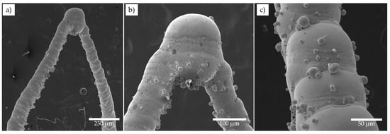 In Figure 11 SEM images of the upper part of the P100V850 SAF sample is presented at different magnifications. The tip region is shown in Figure 11a,b accumulated the highest deviations from the prescribed single track design. There is no thickening of the tip in the 3D model (see Figure 2a), but it occurs on the printed sample and arises because of quasi-continuous laser mode which does not allow to make a single pulse of laser energy in the point. However, such thickening does not affect SAF performance (abrasive cleaning). The inherent layering effect can be clearly observed in Figure 11c. Since the SAFs were manufactured on the edge of resolution such layering effect is inevitable. Besides, fused particles on the SAF surface are presented that are common surface defects [20], but considering synthesized object dimensions these defects become more influential. Both surface irregularities (layering and fused particles) possibly can be removed by chemical etching [42].