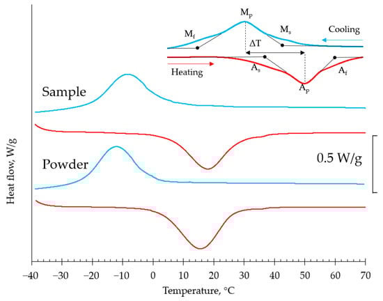As-built P100V850 sample that was found to be optimal for manufacturing of single track SAF files were subjected to DSC testing and compared with the raw powder DSC results. Figure 12 shows the typical DSC curves for raw powder and a cut sample from a file. The exact values of characteristic transformation temperatures were found for reversible martensite phase transition during the heating/cooling cycle and presented in Table 2. The DSC curves are represented with a single peak that corresponds to the direct cubic-monoclinic B2-B19′ transformation without intermediate rhombohedral R phase. It is seen from Figure 12 that thermal hysteresis of the transition is observed which is typical for NiTi alloys [43].