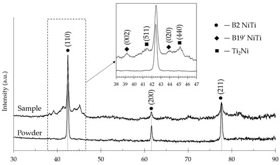 The X-ray diffractograms recorded at room temperature of raw powder and as-build file are presented in Figure 13. It is seen that the initial phase composition of the powder was represented by the high-temperature B2 austenite phase. After the LBPF process, a few peaks of a low-temperature phase (B19′-martensite) were observed which align well with the found increase of the Af temperature in the DSC analysis. However, both diffractograms primarily correspond to B2-phase with typical X-ray peak intensity ratio close to isotropic NiTi alloy: very strong {110}, weak {200} and medium-strong {211}.