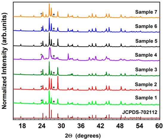 Figure 1 shows the X-ray powder diffraction (XRD) patterns of the studied samples. The XRD patterns of all samples were relatively well matched with pure BaSiO3 (JCPDS-702112) within the accuracy of our XRD equipment, indicating that the studied samples were single-phased BaSiO3, which crystallizes in an orthorhombic structure and has a space group of P212121 with lattice constants of a = 0.4580 nm, b = 0.5611 nm, and c = 1.2431 nm, α = β = γ = 90° [7]. This also means that the activator Eu(2+/3+) ions and co-doping ions R+/3+ which were small-doped in the samples, did not cause any significant changes in the crystal phase of BaSiO3. Miscellaneous minor peaks were marked with a plus (+) and an asterisk (*). The XRD patterns of samples 8–14, prepared under a reducing atmosphere, were identical to those of samples 1–7 because there was no change in crystallinity even if the secondary heat treatment was performed under a reducing atmosphere. The XRD patterns of the samples prepared under a reducing atmosphere are thus not presented in Figure 1.