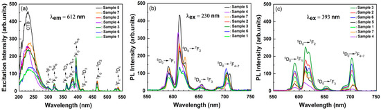 Excitation spectra (a) obtained by monitoring the emission at 612 nm, emission spectra at an excitation wavelength of (b) 230 nm and (c) 393 nm for Ba0.96SiO3:0.02Eu3+, 0.02R+/3+ phosphors (samples 1–7).