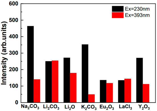 Effect of co-doping on the PL intensity of Eu3+ ions excited by 230 nm and 393 nm, respectively.