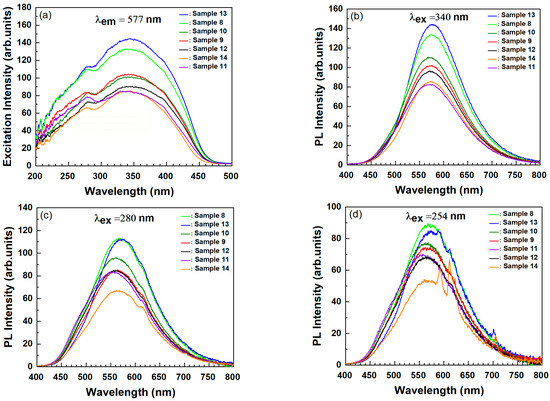 Figure 4a–d shows the PLE and PL spectra of the studied BaSiO3:Eu2+ phosphors (samples 8–14). The PLE spectra, measured by monitoring the 577 nm emission intensity, are shown in Figure 4a. The PLE spectra cover a very broad region, from 200 to 450 nm, with two peaks of 280 nm and 340 nm. The broad excitation covered the UV/vis range widely, which matches well with commercial LED chip emissions, so this phosphor is suitable for solid-state lighting based on an n-UV LED chip. The broad excitation band is commonly ascribed to the crystal-field split 4f65d1 configuration of Eu2+ ions. It is well known that the 4f65d1 electron state is not shielded from anion ligands in the compounds. It has thus been suggested that the 4f65d1 electron state has a strong interaction with neighboring anion ligands in the BaSiO3 host, which results in a broad excitation band, as shown in Figure 4a. Since samples 8–14 were actually the same as samples 1–7, which were heat-treated in air, except for the fact that samples 8–14 were heat-treated in a reducing atmosphere, and the ionic radius of Eu3+ (0.0947 nm) was smaller than that of Ba (0.135 nm), it was expected that Eu2+ ions in sample 8–14 would replace the Ba sites of BaSiO3. The excitation spectrum shown in Figure 4a has two peaks at 280 nm and 340 nm, which corresponds to the crystal-field splitting of the 5d levels in the excited 4f65d1 configuration of the Eu2+. The excitation spectra for samples 8–14 show a similar pattern, even though the relative excitation intensity over the whole excitation band is slightly different.