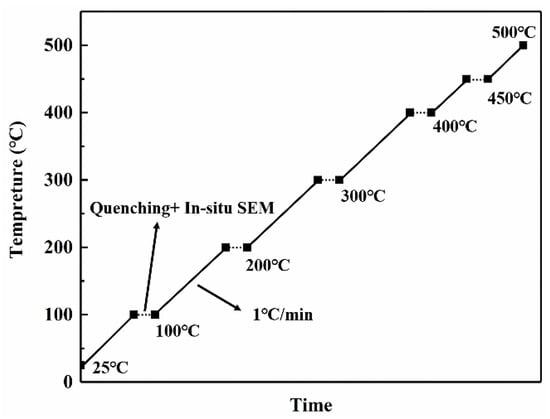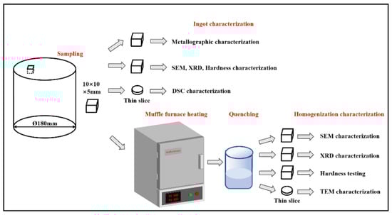A 10 × 10 × 5 mm sample was taken from the ingot. We cut a small-sized sample to reduce the temperature difference between the interior and exterior of the sample during homogenization. The sample was put into the muffle furnace (SG-XS1700, Shanghai Sager Furnace Co., Limited, Shanghai, China) and heated from 25 °C to 500 °C; the heating rate of the muffle furnace was 1 °C/min and the temperature error was controlled within ±1 °C. The sample was quenched with water (less than 5 s) after reaching 100 °C, 200 °C, 300 °C, 400 °C, 450 °C and 500 °C, followed by quasi in situ SEM observations. The observation area was located by Vickers hardness indentation on the sample. The temperature of the furnace was maintained until the sample was put back after finishing quasi in situ SEM observation. The homogenization procedure is presented in Figure 1, and the workflow diagram is displayed in Figure 2.
