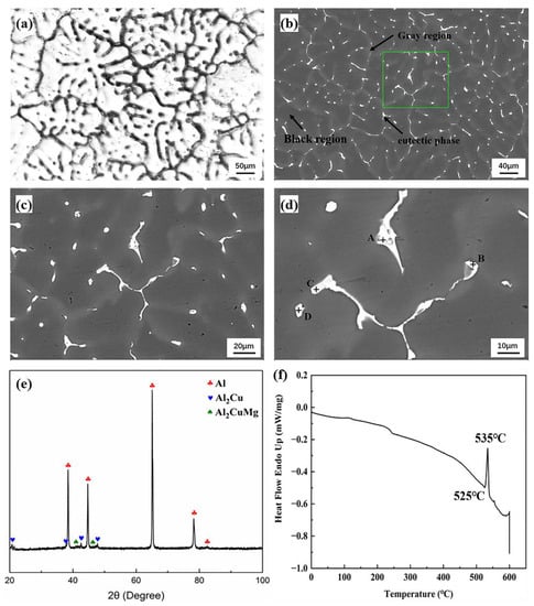 Figure 3a displays the metallographic image of the 2195 ingot, where obvious dendritic structures are observed, and the mean grain size is 150–250 μm. Figure 3b displays the backscattered SEM image of the ingot, and the boxed area in the Figure is the quasi in situ observation zone (QISOZ). As shown by the arrows, there is a high number of gray regions (these regions were proved to be Cu segregation zones in Figure 4); the non-equilibrium eutectic phases are distributed in the gray regions. The size and shape of these gray regions are similar to the corroded zones in the metallographic image. Figure 3c,d show the QISOZ backscattered SEM images at 500× and 1000× magnification, respectively. The EDS results of each point in Figure 3d are shown in Table 2. There are θ and S phases in the ingot, and a certain amount of Ag exists in the S phase. This is because the interactive energy between Ag and Mg atoms was strong (−0.0632 eV) [34]; hence, Ag is easily combined with Mg to form Mg-Ag clusters [35,36,37,38,39]. Figure 3e presents the XRD result of 2195 ingot. Besides α(Al), θ phases and S phases also exist in the ingot, which is identical to the EDS results in Figure 3d. Figure 3f displays the DSC result of the ingot. There is an apparent endothermic peak at 525 °C in the ingot, which led to the melting of some low-melting-point eutectic phases, indicating that the non-equilibrium solidus temperature of the ingot is 525 °C. Therefore, in this study, the maximum temperature of the homogenization was chosen to be 500 °C to avoid over-burning the sample.