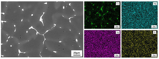 The evolution of the microstructure during homogenization was investigated with a Scanning Electron Microscopy (SEM) (EVO MA10, ZEISS, Oberkochen, Germany) instrument possessing an Energy Dispersive Spectrometer (EDS) detector; the accelerating voltage is 20 kV, and the elemental distribution was studied using the EDS line-scanning (LS) and map-scanning (MS) modes. The SEM resolution was 3.0 nm.