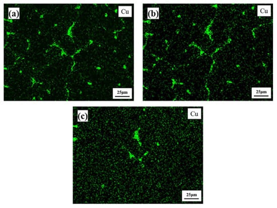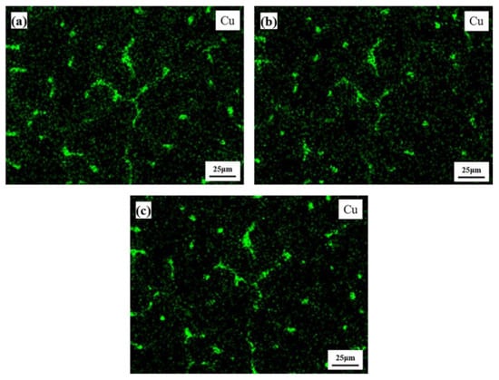 Figure 11 shows the EDS elemental distribution of Cu when the sample is heated to 400 °C, 450 °C and 500 °C. Cu becomes increasingly dispersed with elevated temperatures, and the θ phases on the grain boundary are first coarsened at 450 °C and then dissolved at 500 °C. This indicates that while the temperature was increased from 400 °C to 450 °C, the dissolution speed of the θ phase located on the grain boundary is less than the diffusion speed of Cu to the grain boundary in the Cu-SZ, and part of the Cu in the Cu-SZ directly diffuses into the grain, so the dispersion degree of Cu increases. The distribution of Cu at 500 °C is more dispersive than that at 450 °C because TB phases and most of the θ phases are dissolved and increase the supersaturation of Cu in the alloy matrix.