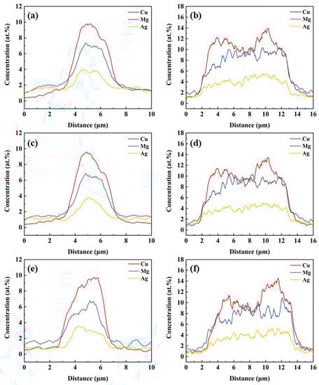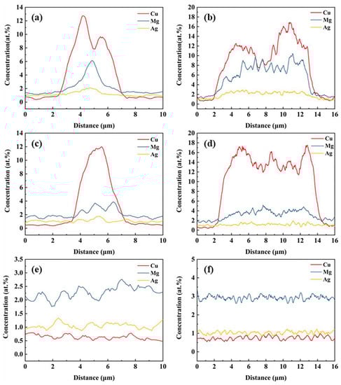 Figure 12 shows the elemental distributions along L1 and L2 at 400 °C, 450 °C and 500 °C. Compared with low-temperature data (see Figure 7e–f), Mg and Ag concentrations along L1 and L2 are decreased at 400 °C and the segregation of Ag disappears. When the temperature rises to 450 °C, the segregation of Mg along L1 and L2 is also removed, which is in keeping with the diminished XRD peaks in the S phases at 450 °C (see Figure 9). This suggests that diffusion of Ag and Mg from the S phase into the matrix is probably only activated above 300 °C and completed at 450 °C, transforming the S phase into the θ phase. Figure 12e,f show that the θ phases are dissolved when homogenizing at 500 °C.