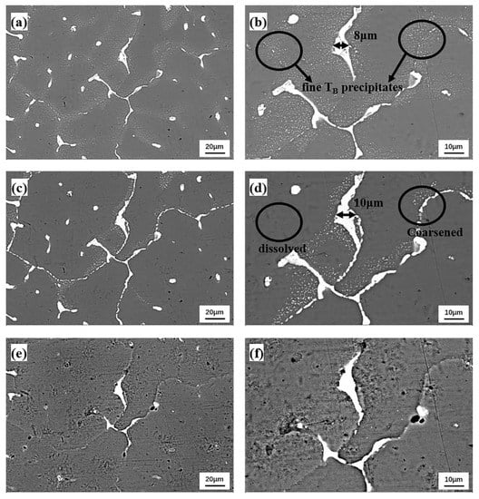 Figure 8 displays the backscattered SEM pictures of the sample at 400 °C, 450 °C and 500 °C, with QISOZ magnifications of 500 and 1000 times. Although the morphology of the eutectic phase does not significantly change at 400 °C, and Cu-SZ is still observed, small precipitates are noticed in the Cu-SZ for the first time. These small precipitates are probably Cu-containing phases (confirmed as TB phases in Figure 9), as they are formed within the Cu-SZ. After further increasing the temperature to 450 °C, the Cu-SZ disappears, and the precipitates are roughened and uninterruptedly distributed on the grain boundary. The small precipitates that were previously observed in the grain interior are partially dissolved (circled in the picture), and the θ phases on the grain boundary are coarsened. This phenomenon can be elucidated by the Ostwald ripening theory [42,43,44,45]: because the fine TB phases dissolve and the large TB phases grow, the specific interface energy per unit quality decreases, and the total free energy of the system decreases. When the temperature reaches 500 °C, all the precipitates located on the grain boundaries are dissolved, and most of the small-sized eutectic phases dispersed within the grains are dissolved, leaving only large eutectic phases at the triangular grain boundary owing to their relatively slow dissolution speed. Additionally, some over-burnt pits can be found in the region with θ phases. This is because these samples were directly transferred to the furnace at 450 °C, and underwent subsequent heating from 450 °C to 500 °C over 50 min. It was reported [46] that when the temperature of the alloy rises rapidly, and beyond the melting point of the θ phase, θ phases will rapidly dissolve and leave obvious over-burnt pits.