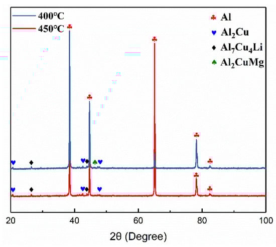 Figure 9 shows the XRD result of the sample at 400 °C and 450 °C. When contrasted with the XRD result of the ingot at 400 °C, the diffraction peak of the TB phase appears, and the peak strength of the S phase is weakened. At 450 °C, there is no diffraction peak of the S phase. Therefore, the fine precipitates observed at 400 °C are TB phases, and the TB phases coarsened at 450 °C.