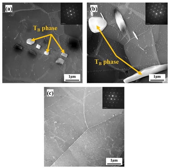 Figure 10 shows the TEM images along the <110>Al zone axis of the sample heated to 400 °C, 450 °C and 500 °C. At 400 °C, fine TB phases precipitate at and close to the grain boundary, and the TB phases are coarsened at 450 °C. When the temperature increases to 500 °C, the TB phases dissolve in the matrix. The TEM results are in keeping with the SEM results above.
