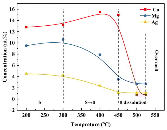 Figure 13 summarizes the evolution of the elemental concentration in the S phase during homogenization. The concentrations of Cu, Mg and Ag show almost no changes before 300 °C; from 300 °C to 400 °C, Mg and Ag decrease while Cu slightly increases, suggesting that the S phase gradually transforms into the θ phase. Upon further increasing the temperature to 450 °C, the quantity of Cu starts to decrease as the S phase is continuously transformed into the θ phase and the θ phase is gradually dissolved within this temperature range; finally, from 450 °C to 500 °C, the transformed θ phase dissolves into the matrix, leading to a sharp decrease in Cu concentration.