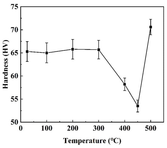 Figure 14 shows the evolution of sample hardness during homogenization. Before 300 °C, the hardness barely changes at around 66 HV, which is consistent with the invariant phase configuration below 300 °C. When the temperature is improved from 300 °C to 450 °C, the hardness of the sample reduces from 66 HV to 54 HV, probably due to annealing-induced stress relief and recrystallization at this temperature [47]. The hardness of the sample rises from 54 HV to 71 HV when the temperature is increased to 500 °C, which is in keeping with our experimental observation (Figure 11) that most eutectic phases dissolve at this temperature and the supersaturation of Cu in the matrix has an apparent increase, leading to enhanced hardness.