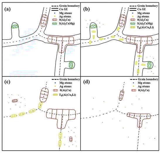 Based on the above observations, Figure 15 illustrates the possible phase evolution process of the 2195 alloy during homogenization. As shown in Figure 15a, the microstructure of the sample does not alter when the temperature is elevated from 25 °C to 300 °C. When the temperature is improved to 400 °C (see Figure 15b), TB phases precipitate from the Cu-SZ; this phenomenon was not found in previous studies. Ag and Mg in S phases diffuse into the matrix, and the segregation of Ag disappears. When further heated to 450 °C (see Figure 15c), the Cu-SZ disappears, the TB phases and θ phases on the grain boundary are coarsened, Mg in the S phases continuously diffuses towards the matrix, transforming the S phase into the θ phase, and the newly formed θ phase starts to dissolve, which is consistent to the XRD results (see Figure 9) and aforementioned diffusivity calculation. Chen et al. [30] previously found that TB and θ phases coarsened during the homogenization of the Al-5Cu-1Li-0.6Mg alloy, and Yang et al. [29] previously found that the S phase dissolved before the θ phase in the Al-3.52Cu-1.28Li-0.38Mg alloy. However, Chen did not distinguish the primary TB eutectic phase from the later precipitated TB phase, and neither of them found that the S phase transformed into the θ phase during homogenization. Some researchers have found the η-S phase transformation during the homogenization of the 7-series alloy (Al-Zn-Mg-Cu) by calculating the atomic diffusion velocity, SEM observation, TEM observation and other means [48,49], the S-θ phase transformation in this work could have similar behaviors. In further research, we will perform a more in-depth study on the S-θ phase transition, including the kinetics of such transformation and the effects of alloying elements and pretreatment parameters on this process, and apply computational simulations to study the microstructural evolution of Al-Cu-Li alloys. At 500 °C (see Figure 15d), the TB phases located on the crystal boundary and the small-sized θ phases in the grain interior were all dissolved, and the large θ phases were partially dissolved, while the θ phases at the triangular crystal boundary dissolved more slowly.