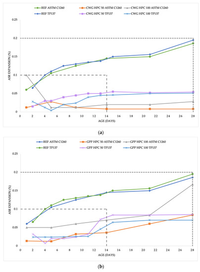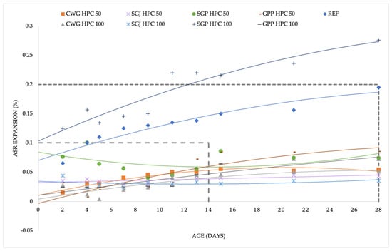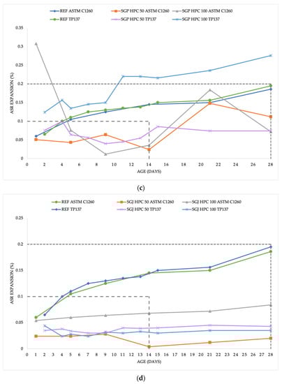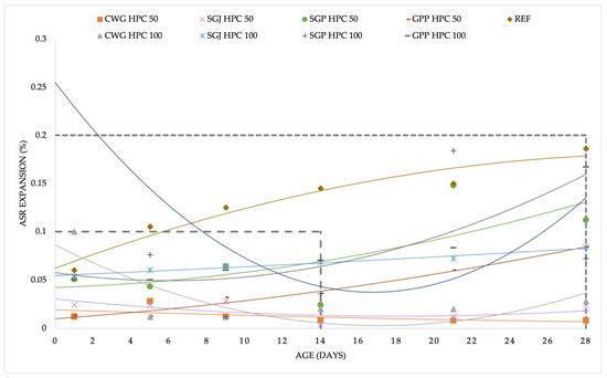 - According to the standards, the conditions to exclude the occurrence of an ASR in the mixtures CWG HPC 50, CWH HPC 100, SGJ HPC 50, SGJ HPC 100, SGP HPC 50, and GPP HPC 50 were fulfilled.