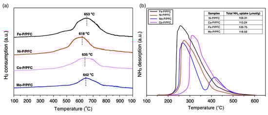 Figure 2a illustrates the H2-TPR profile of the studied catalysts, which were provided to carry out the reduction ability of the synthesized catalysts. The H2-TPR profiles exhibited a character of a single peak at 550–700 °C that described the phosphate compounds reducing to metal phosphides. In addition, the total amount of H2 consumption of relative catalysts is listed in Table 1. The strong interaction between the metal species and carbon support surface was found in the broad peak of the H2-TPR profiles. The higher reduction temperature revealed an initial water loss peak between 550 and 650 °C, followed by a slowly developed broad feature with a high temperature at about 750 °C for all studied catalysts. The maximum reduction occurs at 600–700 °C. The reduction temperature of the obtained catalysts follows a trend: Fe-P > Co-P~Mo-P > Ni-P. Moreover, well-dispersed Metal-P particles revealed an increase in the amount of H2 consumption and the reduction temperature of catalysts (as seen in TEM images). This is because the small catalyst particles seemingly presented a higher interaction with the carbon surface [28,29].