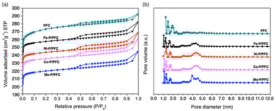 (a) Nitrogen sorption isotherms. (b) Pore size distribution obtained by applying the DFT method to the desorption step of PFC support and catalysts at −196 °C.
