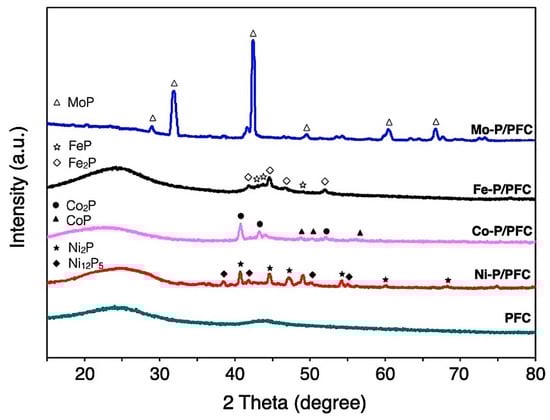 The XRD diffraction of the studied catalysts is represented in diffraction peaks, as seen in Figure 4. All XRD patterns show a spectrum at 15–35° of 2θ angle, which was the amorphous carbon diffraction [33]. Average metal-crystal sizes were determined by the Scherrer equation using XRD intensity of relative catalyst using all of the observed peaks from the analysis (labelled peak as seen in Figure 4), which are reported in Table 1. The domain sizes of catalysts followed the trend: Co-P > Ni-P > Mo-P~Fe-P, and the obtained values complied with the observation by high-resolution TEM, as illustrated in Figure 5. In the case of PFC support, the diffraction line is not observed due to the amorphous structure of carbon. Hence, it was impossible to determine this crystalline phase’s average domain size.