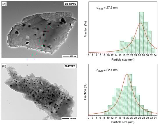 Figure 5a presents the surface morphology of the Co-P/PFC catalyst, which contained poor catalyst particle dispersion due to metal aggregation. This indicated that a sufficient formation temperature was reached, and it may reach the transformation of Co2P to the CoP species from the harsh conditions during catalyst preparation [34,35]. In the case of the Ni-P/PFC catalyst, a mixture of Ni2P and Ni12P particles was observed on the carbon surface, which exhibits a spherical shape with high dispersion, as shown in Figure 5b, suggesting that the Ni species exhibited an excellent dispersion on different supports [35,37].