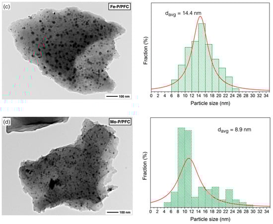 Moreover, the TEM image of Fe-P and Mo-P supported on PFC catalysts are displayed in Figure 5c,d. The particles of these two phosphide catalysts have a spherical shape with excellent dispersion on the carbon support surface. The highest dispersion of metal phosphide was observed on the Fe-P/PFC and Mo-P/PFC catalysts, respectively. From these findings, we could imply that the Fe-P/PFC and Mo-P/PFC catalysts could exhibit excellent hydrocracking activity and selectivity for bio-jet fuel production. The Fe-P and Mo-P nanoparticles were well-dispersed on the PFC surface compared to the Ni-P and Co-P catalysts. The average particle sizes and particle size distribution are also displayed in Figure 5. The Co-P, Ni-P, Fe-P and Mo-P nanoparticles have an average size between 8.9 and 27.3 nm. However, the particle size distribution of metal phosphide nanoparticles is correlated with crystallite size, as shown in the XRD analysis.