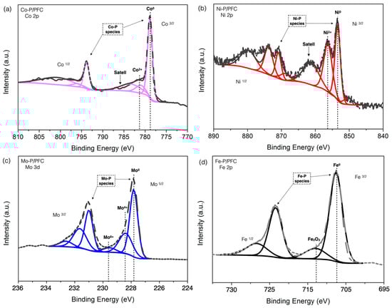 Moreover, XPS spectra of reduced catalysts are displayed in Figure 6 with the binding energies of Co 2p3/2, Ni 2p3/2, Mo 2p5/2, and Fe 2p3/2 core levels. A sharp peak in Figure 6a and low binding energy at 778.3 eV is attributed to the Coδ+ species, represented in the phosphide s(Co2P or CoP phase). There is another peak at the higher binding energies located at approximately 782.0 eV, which is mainly attributed to unreduced species (Co2+ ions) from the phosphate and oxide groups, resulting from the incomplete reduction and surface oxidation during XPS sample preparation [17].