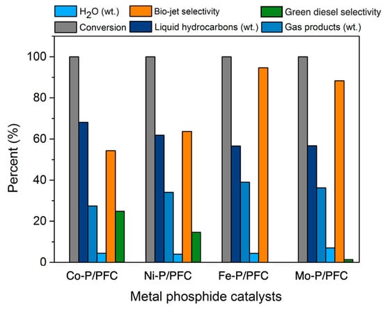 In this section, the tests of synthesized metal phosphide/PFC catalysts for the palm olein hydrocracking to produce a bio-jet fuel were employed in a stainless-steel trickle bed continuous flow reactor. The effects of different metal phosphide catalysts were investigated in terms of their contribution to liquid hydrocarbon products. The experimental condition was fixed at a reaction temperature of 420 °C, H2 pressure of 50 bar, the H2 flow rate of 100 mL/min, and LHSV of 1 h−1, respectively. Before the reaction, the relative synthesized catalyst was packed in the middle zone of the reactor and subsequently reduced at 600 °C under a H2 flow of 100 cm3/min for 3 h before the start of the reaction. Figure 7 shows the product contribution of palm olein oil hydrocracking over different metal phosphide catalysts. Among four metal phosphide catalysts exhibited very high catalyst activity as 100% palm olein oil conversion was obtained (Figure 7). This might be due to the optimum conditions for hydrocracking and the high performance of metal phosphide species in the hydrotreating process [3,4]. However, the highest hydrocracking activity was obtained from Fe-P, followed by Mo-P due to the very small catalyst particle size and high catalyst dispersion. These product composition results revealed that high active catalysts (Fe-P and Mo-P) obtained lower liquid hydrocarbons yield (56.61% and 56.72%) when compared to Co-P and Ni-P (68.11% and 61.93%). In addition, the gas products were significantly increased due to the cracking reaction of long-chain hydrocarbons to short-chain hydrocarbons [38]. This implies that the Fe-P and Mo-P catalysts were more selective for light molecule hydrocarbons as a bio-jet fuel fraction. The highest bio-jet selectivity was obtained from Fe-P and Mo-P at 95.62% and 88.34%, respectively, as illustrated in Figure 7. However, there is no hydrocarbon in the green diesel fraction (C5–C18 hydrocarbons) obtained from the catalytic test with the supported Fe-P catalyst, while the small amount of green diesel was observed with the Mo-P catalyst yielded approximately 1.87% selectivity. Furthermore, the catalytic deoxygenation of palm oil over the supported Co-P and Ni-P catalysts exhibited about 24.27% and 16.32% green diesel selectivity, respectively. This can imply that the supported Co-P and Ni-P catalysts are insufficient for hydrocracking reactions.