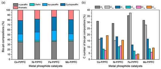 In addition, the product compositions of the obtained bio-jet fuel are shown in Figure 8 and separated into two criteria of bio-jet fuel composition based on hydrocarbon structures (Figure 8a) and C number of bio-jet fuel compositions (Figure 8b). Normal paraffin hydrocarbons (n-paraffins), which have a high-quality hydrocarbon structure in fuels, become the desired product in bio-jet fuel fractions [4,38]. The studied catalysts exhibited a high bio-jet in n-paraffins between 35.27 and 37.13%. The highest percentage of n-paraffins was obtained from Fe-P. In addition, a significant reduction of aromatics in the product was obtained from Fe-P (reduced from 21.12% to 13.87%). This refers to the high catalyst performance in the hydrocracking reaction, and it shows the effectiveness for producing high-quality biofuel since the aromatics may increase the cold flow property of biofuel [38,39]. However, the results revealed that the highly active catalyst (Fe-P) tended to promote the isomerization of the short-chain hydrocarbons, indicating a significant increase in iso-paraffin yield. This could be due to the hydrocracking reaction, high acidity, surface area, and catalyst dispersion.