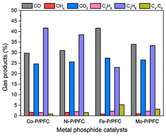 Moreover, the gas product compositions produced during the hydrocracking of palm olein oil, are displayed in Figure 9. The major gas fraction was released from deoxygenation (i.e., hydrodeoxygenation, decarboxylation, and decarbonylation) and hydrocracking reaction in the form of CO/CO2, and gaseous hydrocarbons. Firstly, C3H8 gas is produced from the hydrogenolysis of saturated triglycerides in the palm olein structure. Gas products can be produced more from the cracking reaction of gaseous hydrocarbons such as C4 and C5 hydrocarbons [7,8]. However, the CH4 and C2H6 were increased by the simultaneous cracking of C3H8. The findings revealed that the gas products were mainly composed of CO and CO2, indicating that decarboxylation and decarbonylation were the main routes. In the palm olein hydrocracking over the studied metal phosphide catalysts, the highly active catalysts (Fe-P and Mo-P) showed a q high fraction of bio-jet fuel. Thus, it can be confirmed that the Fe-P and Mo-P catalysts exhibited a high proportion of C4 and C5 gaseous hydrocarbons (Fe-P > Mo-P), a byproduct of the hydrocracking process.