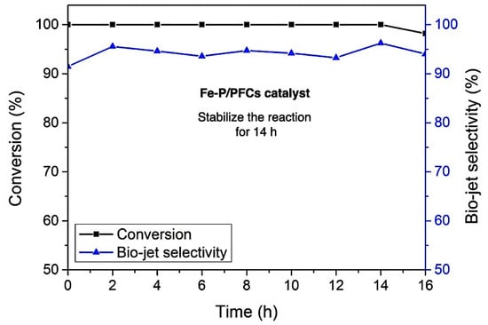 Stability test of Fe-P/PFC catalyst on the palm olein hydrocracking (conversion and bio-jet fuel selectivity). Fe-P/PFC catalyst was selected for the stability test as the effective catalyst to obtain the highest bio-jet fuel selectivity.