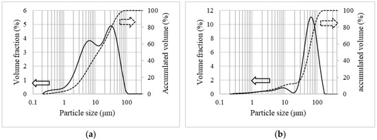 Particle size distribution for the EAFD powders: (a) G1 [15] and (b) G2. The solid lines represent the particle size distribution, and the dashed lines indicate the accumulated volume.
