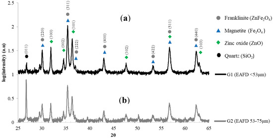Analysis of the XRD patterns (Figure 2) reveals the presence of ZnO and Fe3O4 and/or ZnFe2O4 as major compounds for both G1 and G2. Fe3O4 and ZnFe2O4 share the spinel structure with close cell parameters, and it cannot be concluded here if it is one or the other compound. Using Mössbauer spectroscopy, Machado and collaborators [39] were able to verify the presence of these two phases in an EAFD sample with a finer particle size (average diameter 1.88 μm), the Fe3O4 and ZnFe2O4 representing 14% and 29% of the EAFD, respectively. There is also more free SiO2 in G2 than in G1, which is in agreement with the silicon content found by XRF (Table 1).
