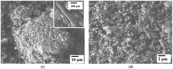 FESEM images (Figure 3) of G1 and G2 reveal that they are made up of spherical agglomerates about 50–80 µm in diameter, with submicronic particles in the 0.1–1 µm range. This suggests that the agglomerates could be relatively easily broken by milling. Few rod-like particles are also observed (about 300 µm long and 30 µm wide), notably for G2 (inset in Figure 3c). Several authors have verified the presence of these spherical agglomerates formed by fine particles or fine particles covering larger particles. Rocabois has pointed out spherical shapes formed from spinel-type metal oxides XFe2O4 (X = Fe, Zn, or Mn) [9,15,40].