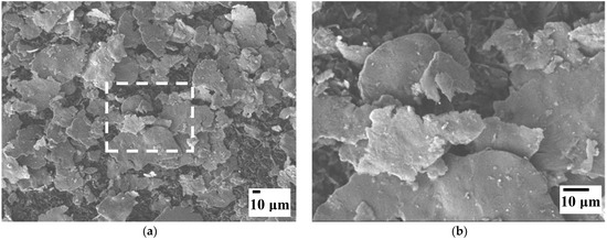 FESEM images (Figure 4) of the AA7075 powder milled during 1 h show that it is made up of micrometric flakes (lateral dimensions 10–100 µm, thickness about 1 µm), which is a typical morphology of milled ductile metals.
