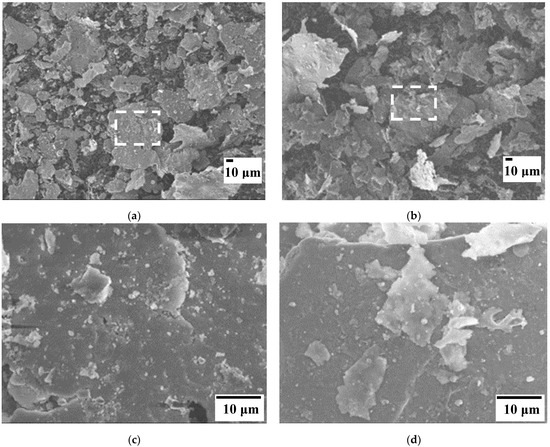 For the composite powders, the EAFD particles are homogeneously dispersed at the surface of the AA7075 flakes (Figure 5). No micrometric EAFD agglomerates are observed. Figure 5a and Figure 5b show, respectively, the appearance of the starting powders 15G1 and 05G2 at low magnification. Figure 5c,d show higher magnification of selected areas in Figure 5a and Figure 5b, respectively. It can be seen that these powders are very similar, differing only in the surface area covered by EAFD on the AA7075 flakes.